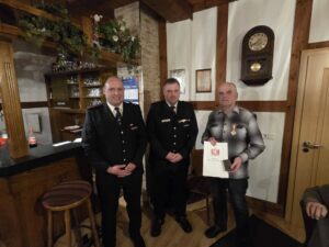 2 von ihnen die „Bronzene Brandschutzmedaille am Bande“ für 10 Jahre Feuerwehrdienst verliehen. Außerdem würden 2 weitere Kameraden für 50 Jahre treue Dienste in der Feuerwehr, mit dem „Großen Brandschutzabzeichen am Bande“ geehrt.